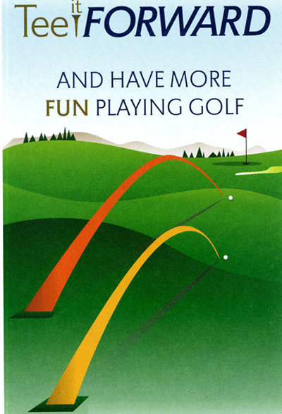 My first impression of “Tee it FORWARD” was simply to match a player’s ability to the length of a golf course. Too often younger golfers, and others who have greater expectations than their skill allows, tee off from the same tees professional or scratch (par) golfers play from. These tee boxes are known as the back tees or the tips. My guess is that this is simply an ego trip, which most frequently results in disappointment and no fun for not only the player but others who have to wait around for those idiots to find lost balls.