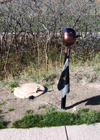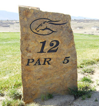 There is no clubhouse yet. There are a couple of restrooms on the course, which are on a quality level with fine hotels. Right now there are only a few porta-potties and a few tee ball washers and trash receptacles. The multi-ball ball washers are modern and copper colored and the trash bins were sunken in the ground with foot pedals to open them…classy. Hopefully both ball washers and trash receptacles will be on every tee. The hole markers are beautifully engraved in native stone. I wonder if they were cut from the front range scar west of Colorado Springs in the Front Range.